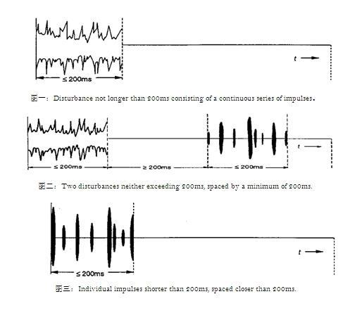 喀嚦聲 (click),一種電壓騷擾,幅度超過(guò)連續(xù)騷擾準(zhǔn)峰值限值,持續(xù)時(shí)間不大于200ms,而且后一個(gè)騷擾離前一個(gè)騷擾至少200ms,持續(xù)時(shí)間由超過(guò)測(cè)量接收機(jī)中頻參考電平的信號(hào)確定。一個(gè)喀嚦聲可能包含許多脈沖,在這種情況下,相關(guān)時(shí)間是從第一個(gè)脈沖開(kāi)始到最后一個(gè)脈沖結(jié)束的時(shí)間。