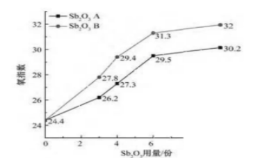 然而,并不是電纜材料中三氧化二銻的含量越高就越好,在符合正常的標(biāo)準(zhǔn)后還是要考慮成本的。電纜的抗燃燒性通常用氧指數(shù)來表現(xiàn),氧指數(shù)越高就說明抗燃燒性越高,上面圖像就是兩種三氧化二銻的含量與氧指數(shù)的關(guān)系圖,當(dāng)三氧化二銻到一定含量之后氧指數(shù)增長就已經(jīng)減緩,因此考慮成本的前提下,可以適當(dāng)調(diào)整三氧化二銻的含量。