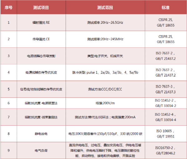 汽車電子產品的主要EMC檢測項目和標準包括:輻射發(fā)射和傳導發(fā)射(CISPR 25);傳導瞬變發(fā)射(ISO 7637—2);輻射抗擾度、傳導抗擾度(ISO 11452系列標準);靜電放電抗擾度(ISO 10605);傳導瞬態(tài)抗擾度(ISO 7637系列標準)等。