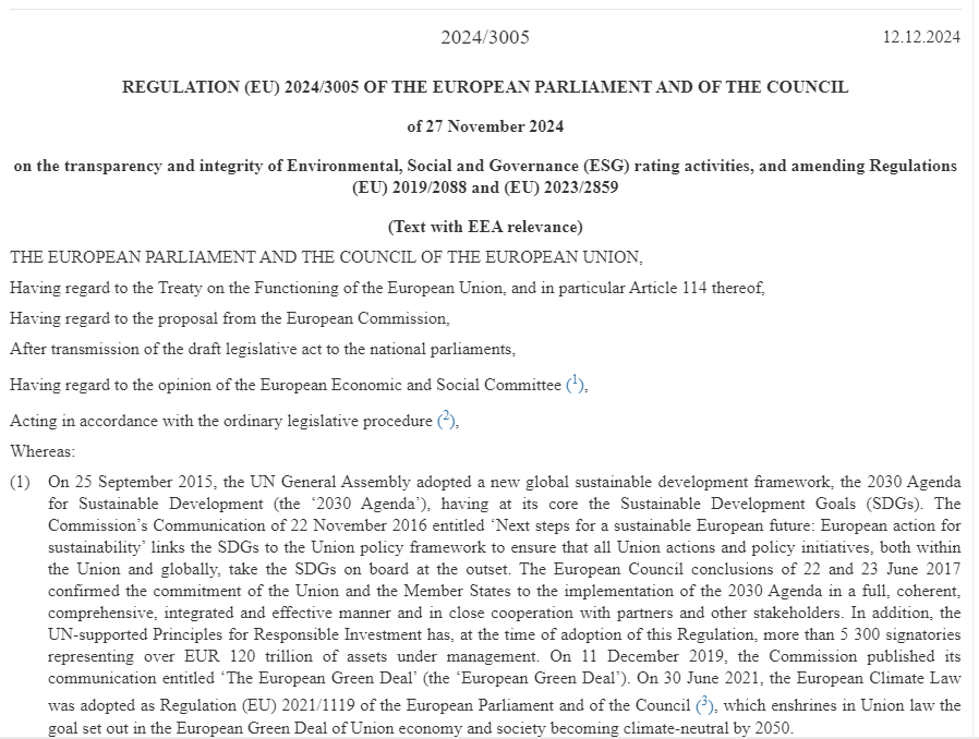 2024年12月12日,歐盟《官方公報(bào)》上正式發(fā)布關(guān)于環(huán)境、社會(huì)和治理(ESG)評(píng)級(jí)活動(dòng)的新法規(guī)[法規(guī)編號(hào)(EU) 2024/3005]。這一新規(guī),對(duì)原有的歐盟法規(guī)(EU) 2019/2088和(EU) 2023/2859做出修訂。這一法規(guī)旨在使歐盟境內(nèi)的ESG評(píng)級(jí)活動(dòng)更加一致、透明并更具可比性。歐盟認(rèn)為,此舉將提升投資者對(duì)可持續(xù)金融產(chǎn)品的信心,并促進(jìn)歐盟內(nèi)部市場的有效運(yùn)作。