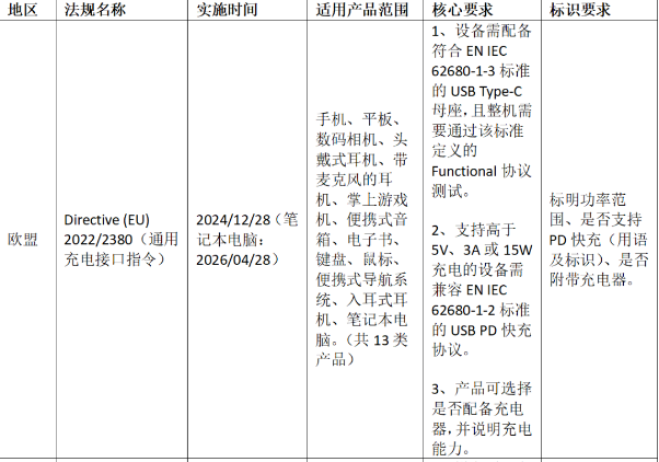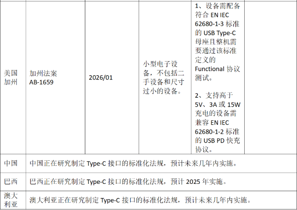 沙特阿拉伯、美國加州、印度等國家和地區(qū)也已出臺相關(guān)法律法規(guī),明確實施時間和要求。各國對Type-C充電器的法規(guī)要求整理如下: