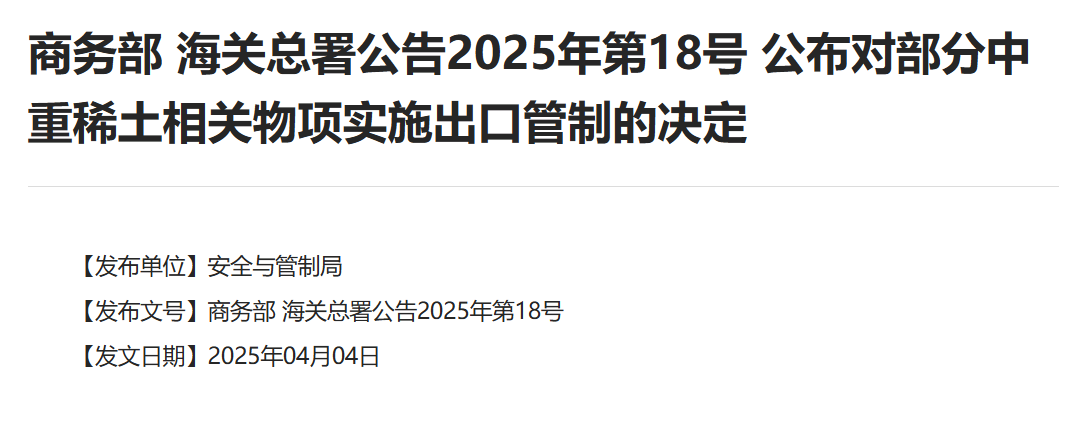 2025年4月4日商務(wù)部 海關(guān)總署公告2025年第18號 公布對部分中重稀土相關(guān)物項實施出口管制的決定。