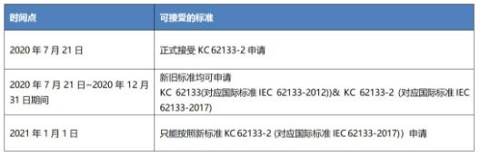 2020年7月21日,韓國技術(shù)標(biāo)準(zhǔn)局KATS(Korean Agency for Technology and Standards)發(fā)布新通知:KC 62133-2 正式確認(rèn)并開始使用。其對應(yīng)的國際標(biāo)準(zhǔn)IEC 62133-2012版和IEC 62133-2017版的CB報(bào)告及證書在2020年12月31前均可以被接受用于KC轉(zhuǎn)證。具體時(shí)間點(diǎn):