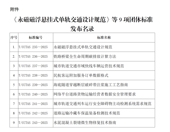 根據(jù)《中國(guó)交通運(yùn)輸協(xié)會(huì)團(tuán)體標(biāo)準(zhǔn)管理辦法》有關(guān)規(guī)定,現(xiàn)批準(zhǔn)發(fā)布《永磁磁浮懸掛式單軌交通設(shè)計(jì)規(guī)范》等9項(xiàng)團(tuán)體標(biāo)準(zhǔn)(見(jiàn)附件),現(xiàn)予公告。