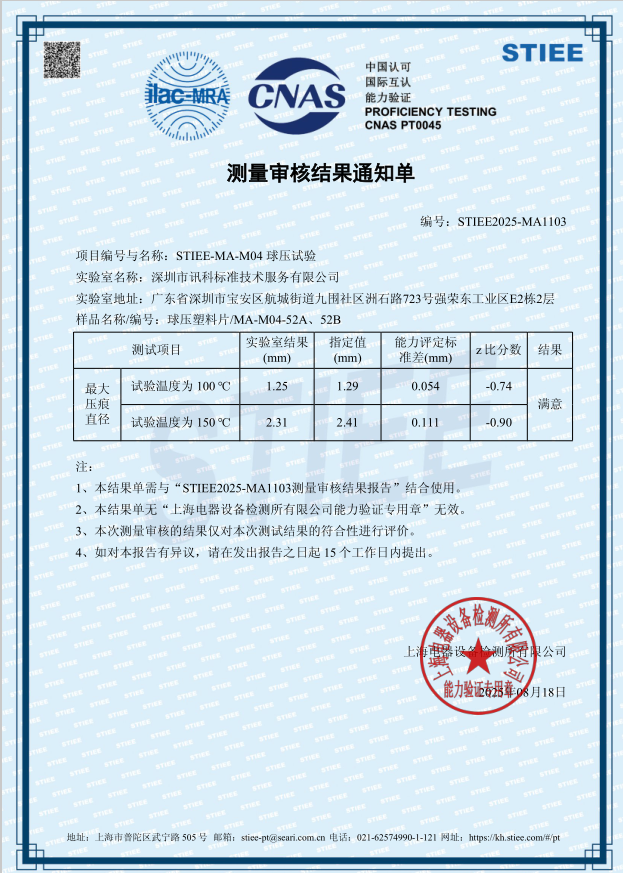 我司STIEE-MA-M04 球壓試驗(yàn)?zāi)芰︱?yàn)證圓滿通過,我們秉承科學(xué)嚴(yán)謹(jǐn)?shù)墓ぷ鲬B(tài)度,以客戶為中心,高效統(tǒng)籌安排測試計劃,竭力縮短測試時間的周期,為客戶提供快捷、公正的第三方咨詢檢測等服務(wù)。服務(wù)區(qū)域遍布廣東廣州、深圳、東莞、佛山、中山、珠海、清遠(yuǎn)、惠州、茂名、揭陽、梅州、江門、肇慶、汕頭、潮州、河源、韶關(guān)及全國各地如您有相關(guān)產(chǎn)品需要咨詢,歡迎您直接來電咨詢我司工作人員,獲得詳細(xì)的費(fèi)用報價與周期方案等信息,深圳訊科期待您的光臨!