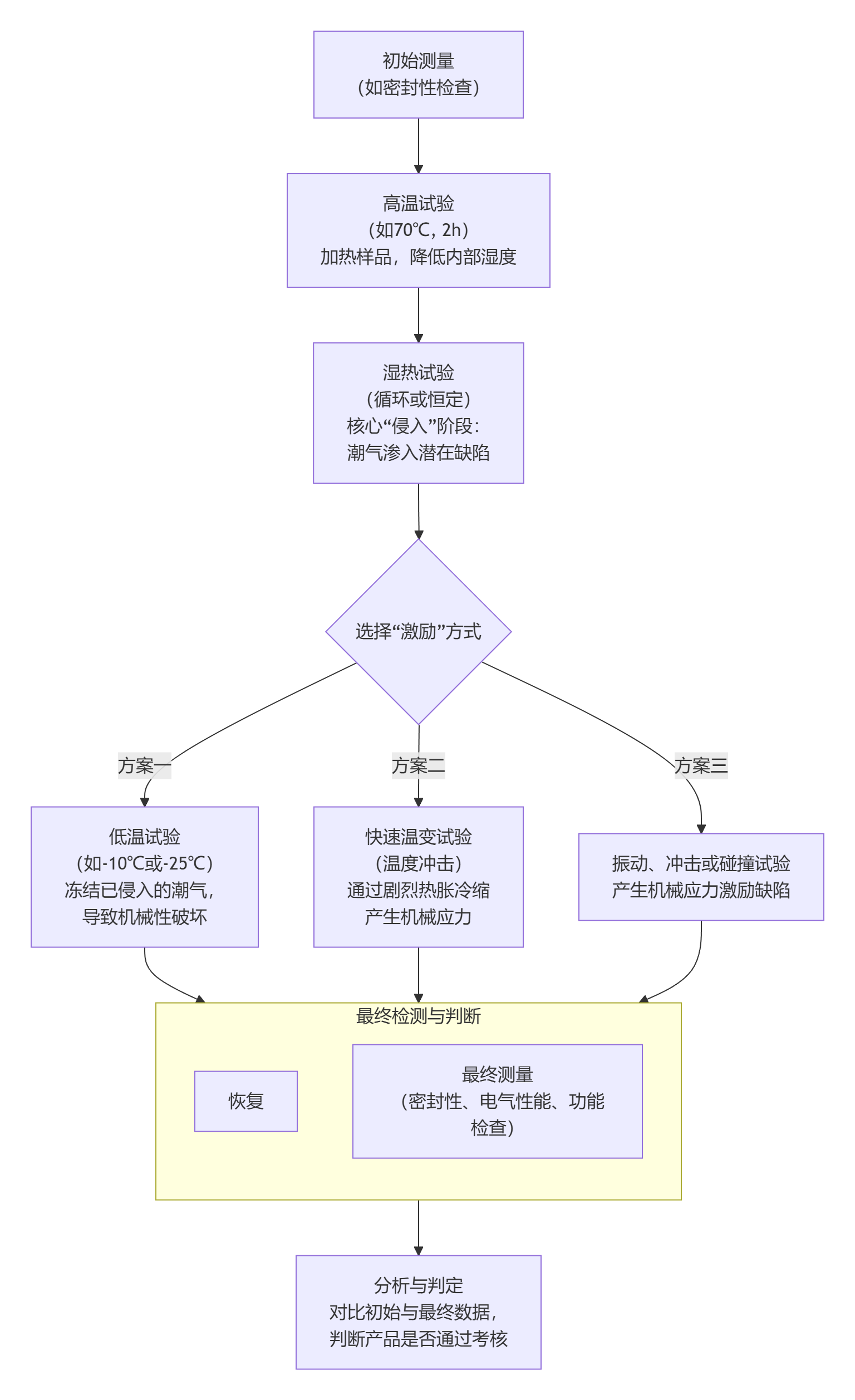 傳統(tǒng)的單一環(huán)境試驗(yàn)(如單獨(dú)進(jìn)行高溫、濕熱或低溫試驗(yàn))有時(shí)不足以暴露產(chǎn)品的所有缺陷。許多故障模式是多種環(huán)境應(yīng)力按特定順序相互作用的結(jié)果。例如,濕熱應(yīng)力侵入后,再經(jīng)歷低溫,可能會(huì)因結(jié)冰或材料收縮而加速失效。