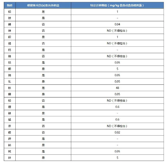 以下是關(guān)于上表1的一些要點(diǎn):重金屬特定遷移的元素種類從原有的9種(鋇、鈷、銅、鐵、鋰、錳、鋅、鋁、鎳限值不變)增至24種(新增銨、銻、砷、鎘、鈣、鉻、銪、釓、鑭、鉛、鎂、汞、鉀、鈉、鋱),其中4種鑭系元素(銪、釓、鑭、鋱)的限值為0.05mg/kg,砷、鉻、鉛、汞的限值為不得檢出(0.01mg/kg),鎘為不得檢出(0.002mg /kg),其他元素沒(méi)有限值要求。