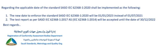 SASO 推遲IEC 62368-1: 2018 強(qiáng)制實(shí)施日期