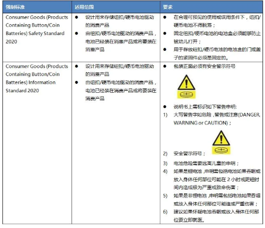 紐扣或硬幣電池可以在各種各樣的產(chǎn)品中找到,包括兒童玩具、照明產(chǎn)品、遙控器、手表等。電玩具一般使用的紐扣/硬幣電池為扁平的圓形單電池,厚度從1-11毫米不等,直徑可達(dá)32毫米。在玩耍電玩具時(shí),兒童如果不慎吞食紐扣/硬幣電池后可導(dǎo)致窒息甚至死亡。2020年12月22日,澳大利亞政府正式生效4個(gè)強(qiáng)制標(biāo)準(zhǔn)來(lái)減少因使用紐扣/硬幣電池造成的傷亡風(fēng)險(xiǎn)。強(qiáng)制性標(biāo)準(zhǔn)包括18個(gè)月過(guò)渡期,從2022年6月22日開(kāi)始,供應(yīng)商必須符合該標(biāo)準(zhǔn)要求。
