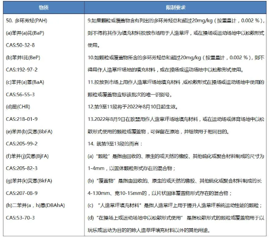 2021年7月21日,歐盟在其官方公報(bào)發(fā)布新法規(guī)(EU) 2021/1199,修訂歐盟REACH法規(guī)((EC) No 1907/2006)附件XVII第50條目,新增在人造草坪、操場(chǎng)或運(yùn)動(dòng)場(chǎng)地中用作填充物的顆?;蚋采w物中多環(huán)芳烴(PAHs)的限制。該新法規(guī)將于歐盟官方公報(bào)發(fā)布后第20天生效。
