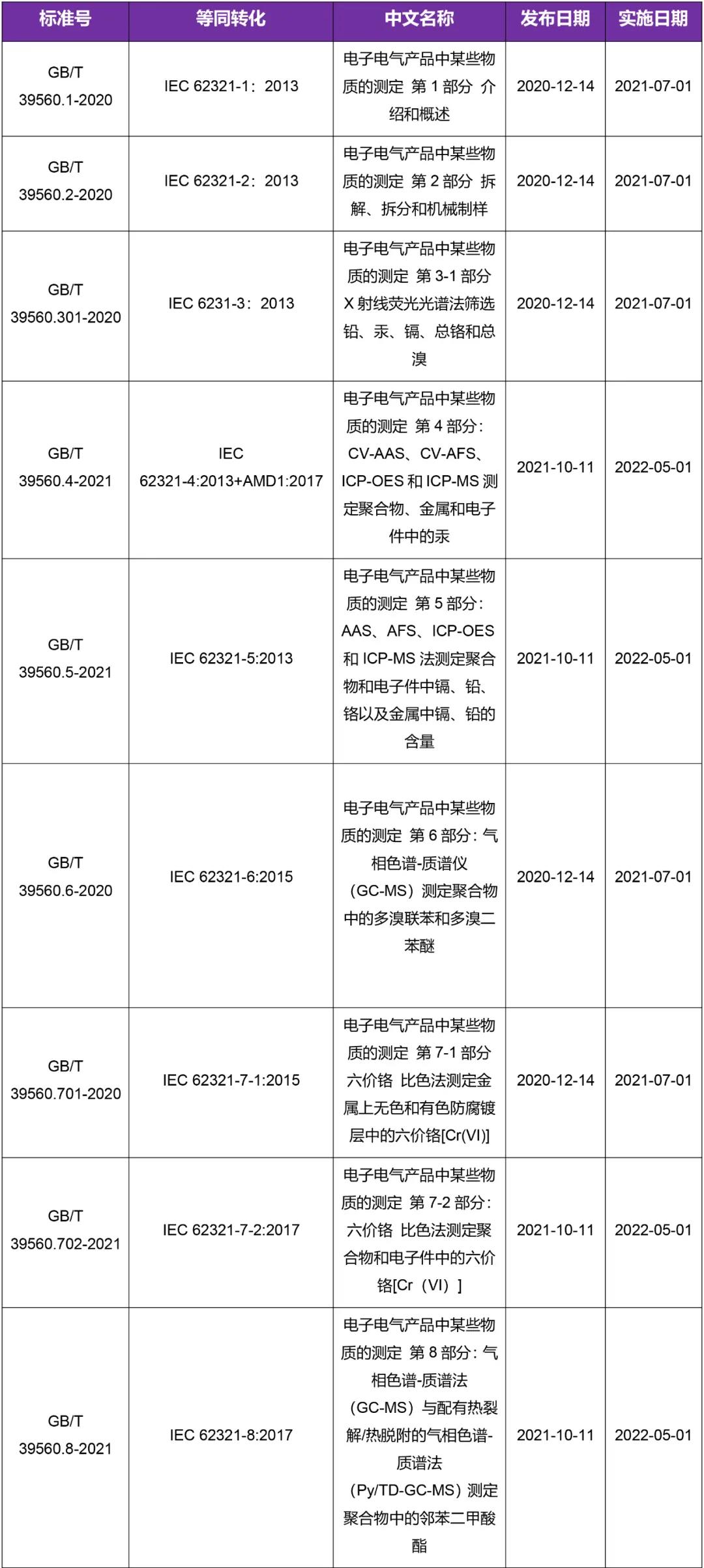 隨著電子電氣領(lǐng)域環(huán)保法規(guī)的加強(qiáng),更多有害物質(zhì)種類(lèi)被限制使用,同時(shí)也出現(xiàn)更先進(jìn)快速的新型檢測(cè)技術(shù),而目前國(guó)內(nèi)電子電氣產(chǎn)品RoHS檢測(cè)標(biāo)準(zhǔn)GB/T 26125:2011是等同采用IEC62321:2008(此標(biāo)準(zhǔn)已經(jīng)按檢測(cè)技術(shù)和限制物質(zhì)種類(lèi)修訂并發(fā)布了9個(gè)系列標(biāo)準(zhǔn))。因此,GB/T 39560系列標(biāo)準(zhǔn)應(yīng)運(yùn)而生,有望替代GB/T 26125成為我國(guó)《電器電子產(chǎn)品有害物質(zhì)使用管理辦法》配套使用標(biāo)準(zhǔn)!
